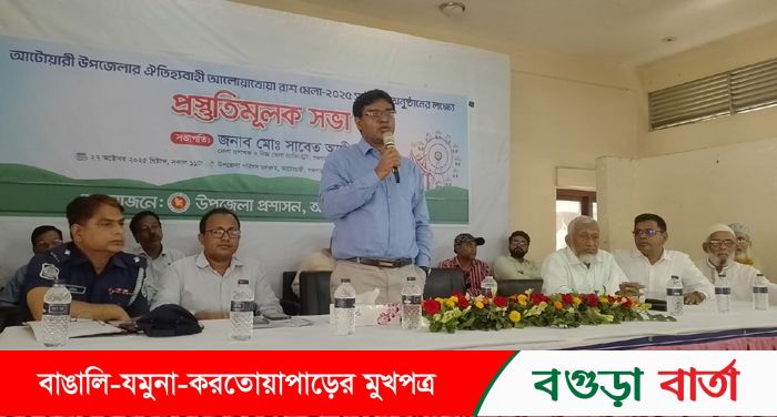 পঞ্চগড়ের ঐতিহ্যবাহী ও ঐতিহাসিক আটোয়ারী আলোয়াখোয়া রাশ মেলা-২০২৫ আয়োজন উপলক্ষে প্রস্তুতিমূলক সভা অনুষ্ঠিত হয়েছে। সোমবার ( ২৭ অক্টোবর) দুপুরে উপজেলা প্রশাসনের আয়োজনে উপজেলা পরিষদ অডিটোরিয়ামে প্রস্তুতিমূলক সভা অনিুষ্ঠিত হয়। এ সময় উপজেলা পরিষদের সাবেক ভাইস চেয়ারম্যান মোঃ শাহাজাহান’কে কন্ঠভোটে সর্বসম্মতিক্রমে আলোয়াখোয়া রাশ মেলা-২০২৫ এর সাধারণ সম্পাদক নির্বাচিত করা হয়। পঞ্চগড় জেলা প্রশাসক মোঃ সাবেত আলী’র সভাপতিত্বে এবং উপজেলা একাডেমিক সুপারভাইজার মোঃ রেজাউন নবী রাজা’র সঞ্চালনায় প্রস্তুতিমূলক সভায় স্বাগত বক্তব্য রাখেন, উপজেলা নির্বাহী অফিসার মোঃ আরিফুজ্জামান। ২০২৪ সালের আলোয়াখোয়া রাশ মেলার আয়-ব্যয় হিসাব নিকাশ উপস্থাপন করেন মেলার সাবেক সাধারণ সম্পাদক ও উপজেলা বিএনপি’র সাধারণ সম্পাদক মোঃ নজরুল ইসলাম দুলাল। অন্যান্যদের মধ্যে বক্তব্য রাখেন, আটোয়ারী থানার অফিসার ইনচার্জ মোঃ রফিকুল ইসলাম সরকার (জুয়েল), উপজেলা বিএনপি’র সভাপতি এ.জেড.এম বজলুর রহমান (জাহেদ), বাংলাদেশ জামায়াতে ইসলামী আটোয়ারী উপজেলা শাখার আমীর মাও ঃ মোঃ ইউনুস আলী খাঁন, সাবেক উপজেলা মুক্তিযোদ্ধা কমন্ডার আলহাজ্ব মোঃ নজরুল ইসলাম, আটোয়ারী উপজেলা প্রেসক্লাবের সভাপতি মোঃ ইউসুফ আলী, বণিক সমিতির সভাপতি কমলেশ চন্দ্র ঘোষ, রাশ পূজা কমিটির পক্ষ থেকে রঞ্জন ঘোষ হিরু, বিএনপি তোড়িয়া ইউনিয়ন কমিটির সভাপতি আতাউর রহমান, ব্যবসায়ী আব্দুল খালেক , পল্লী প্রাণি চিকিৎসক আব্দুল কাদের প্রমুখ। প্রস্তুতিমূলক সভার সিদ্ধান্ত মতে, মেলা আগামী ২০ নভেম্বর- ২০২৫ উদ্বোধন হয়ে চলবে ১৩ ডিসেম্বর পর্যন্ত। তবে আগামী জাতীয় সংসদ নির্বাচনের তফসিল ঘোষনার উপর ভিত্তি করে মেলার মেয়াদ বাড়তে পারে। প্রতিবারের ন্যায় এবারো আলোয়াখোয়া মেলায় গরু, মহিষ,ছাগল, ভেড়া, ঘোড়া ,কাঠ ও স্টীলের আসবাবপত্রসহ নিত্য প্রয়োজনীয় সামগ্রীর বিপুল সমাহার থাকবে। এছাড়াও মনোমুগ্ধকর সুস্থ বিনোদনের পর্যাপ্ত ব্যবস্থা থাকবে। মেলার সভাপতি জেলা প্রশাসক মোঃ সাবেত আলী ও সাধারণ সম্পাদক উপজেলা পরিষদের সাবেক ভাইস চেয়ারম্যান মোঃ শাহাজাহান সুশৃঙ্খল পরিবেশে মেলা পরিচালনার ক্ষেত্রে দল মত নির্বেশেষে সবার সহযোগিতা কামনা করেছেন। এ সময় উপজেলা বিএনপি, জামায়াতে ইসলামী, জাসদ, জাগপা,এনসিপি, গণ অধিকার পরিষদসহ বিভিন্ন রাজনৈতিক দলের নেতৃবৃন্দ, ব্যবসায়ী, মুক্তিযোদ্ধা, গণমাধ্যমকর্মীসহ বিভিন্ন শ্রেণি পেশার মানুষ উপস্থিত ছিলেন।