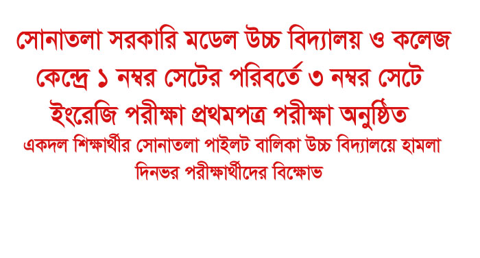 সরকারি সোনাতলা মডেল উচ্চ বিদ্যালয় ও কলেজ কেন্দ্রে ১ নম্বরের পরিবর্তে ৩ নম্বর সেটের প্রশ্নপত্রে ইংরেজি প্রথম পত্র পরীক্ষাঃ একদল শিক্ষার্থীর সোনাতলা পাইলট উচ্চ বিদ্যালয়ে হামলা, দিনভর পরীক্ষার্থীদের বিক্ষোভ