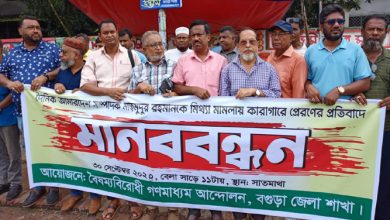 মাহমুদুর রহমানের মুক্তির দাবিতে বৈষম্যবিরোধী গণমাধ্যম আন্দোলন বগুড়ার মানববন্ধন