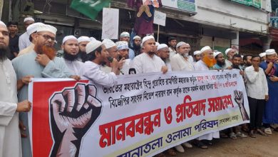 রাসুল (সা.) এর নামে কটুক্তির প্রতিবাদে সোনাতলায় ওলামা পরিষদের মানববন্ধন